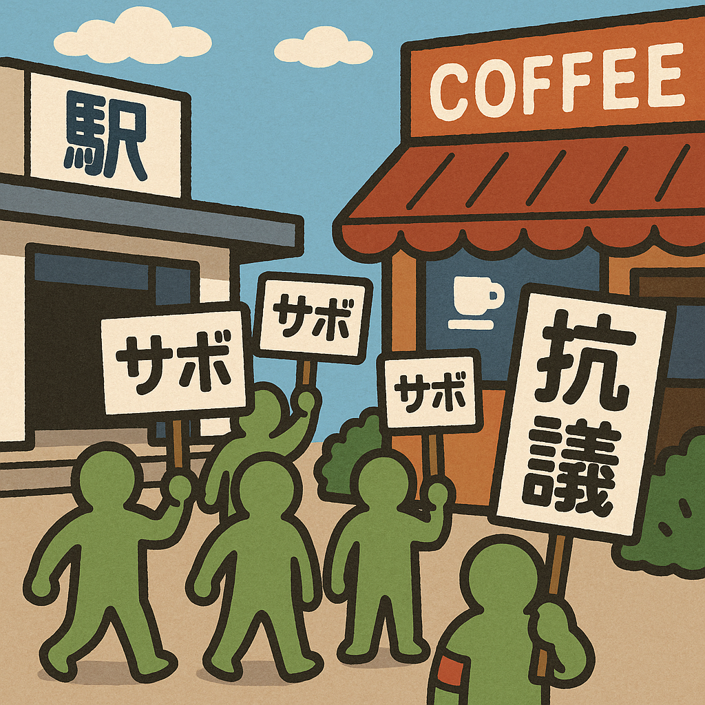 国鉄フォント保護法、駅前の喫茶店まで対象に?町内会がサボを掲げて抗議