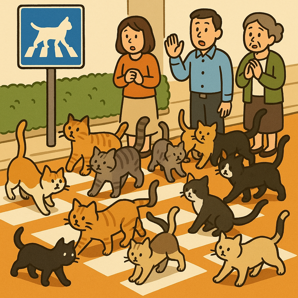 猫専用横断歩道、開通初日から大渋滞 人間も譲り合いで右往左往 泡沫町商店街に今朝、「猫専用横断歩道」が開通した。ひげセンサーが反応すると信号が「にゃー青」になり、スピーカーから小さくゴロゴロ音が流れる…